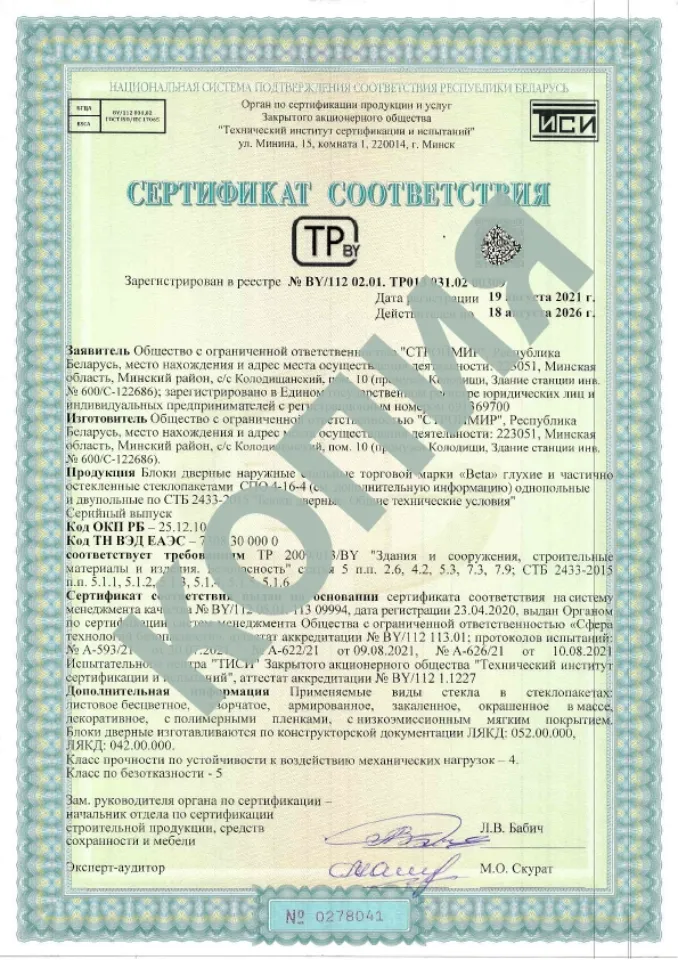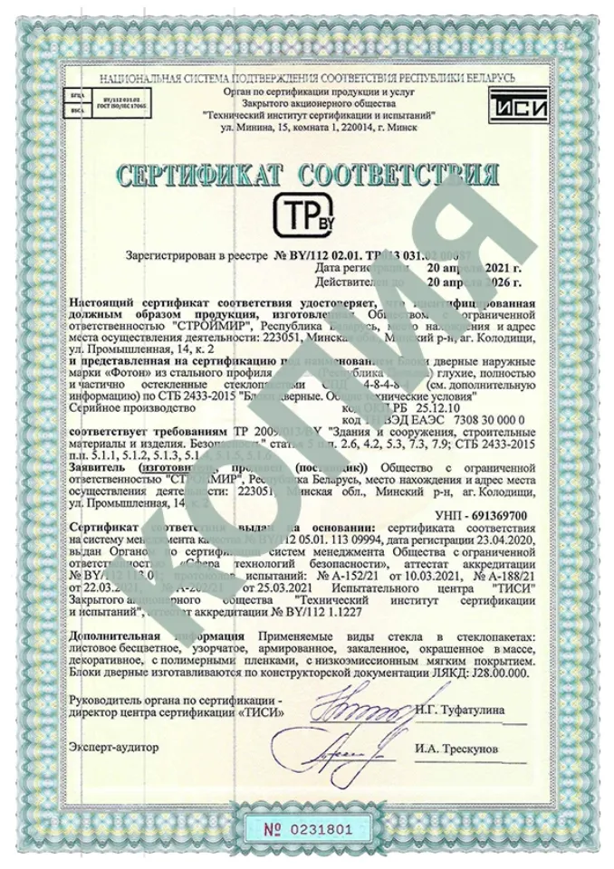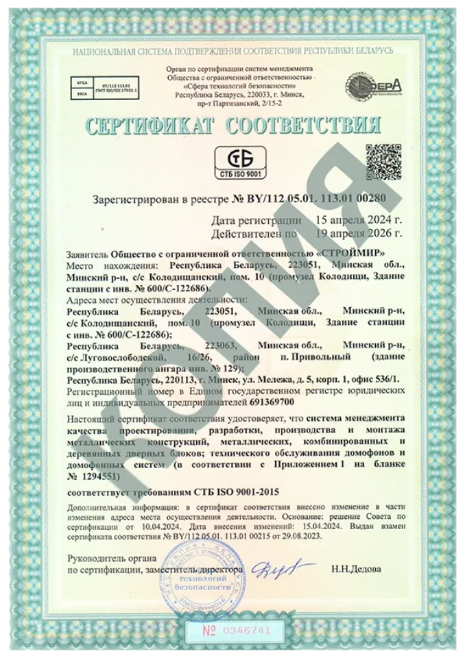 Качество дверей подтверждено сертификатами соответствия. В компании «СТРОЙМИР» внедрена Система менеджмента качества СТБ ISO 9001-2015.